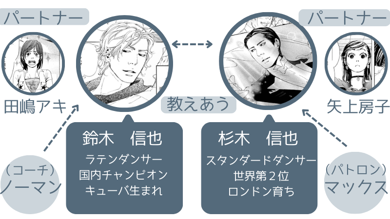 ダンス競技である10ダンスのため、互いに専門のダンスを教えるところから2人の関係はスタートします。