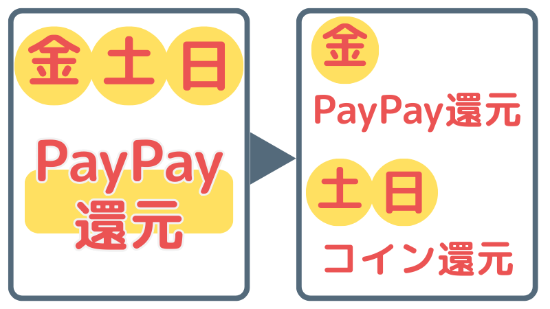 以前は、金土日でPayPay還元が適用。現在は、PayPay還元は金曜日のみ土日はコイン還元に変更