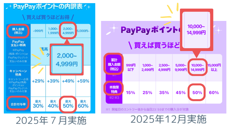 同じ50%還元を受けるために、2025年7月は2,000円以上買えばクリアでした。2025年12月は10,000円以上買う必要があります。