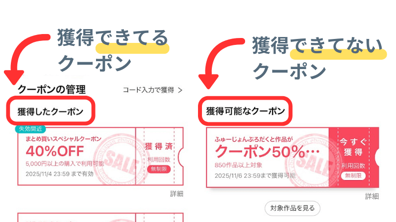 すでに獲得しているクーポンと、その下に獲得できるクーポンが表示されます。