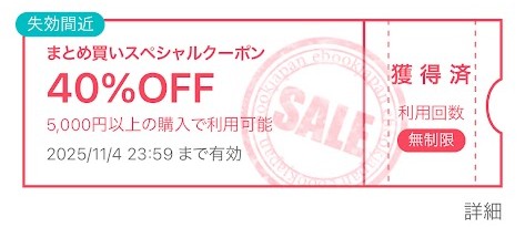 火曜日木曜日にもらえることが多い40%OFFのまとめ買いクーポンです。