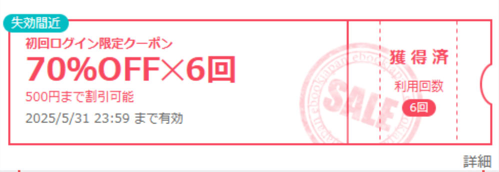 ebookjapanでは、初回や曜日別など多くのタイミングでクーポンが発行されています。